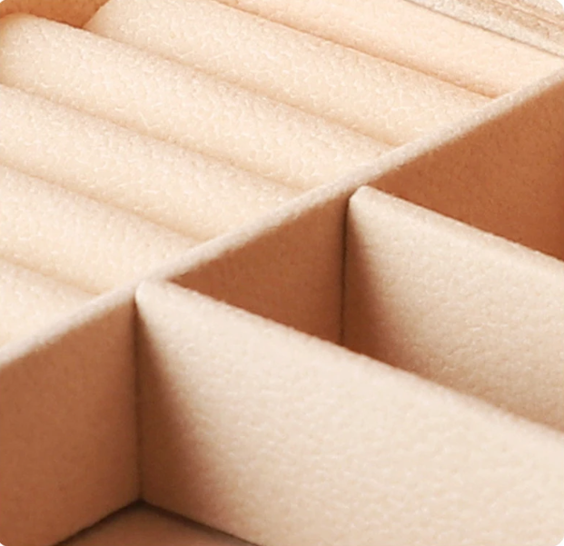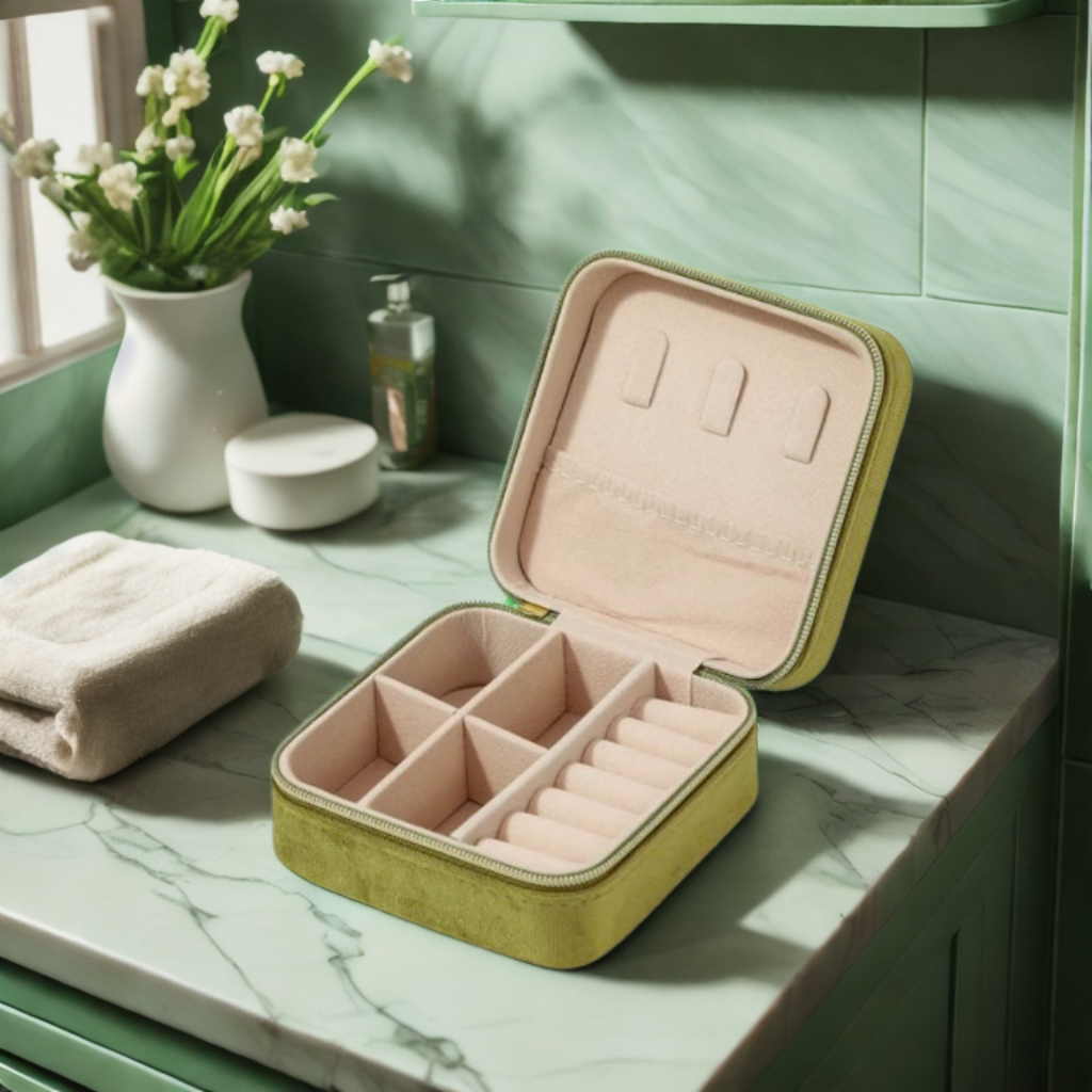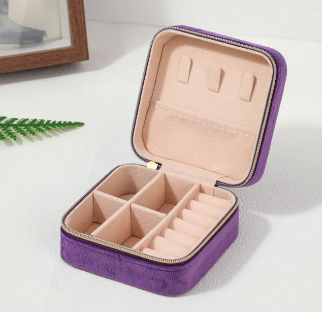 Rangez vos bijoux avec délicatesse grâce aux emplacements sur mesure de notre boîte à bijoux de voyage en velours.