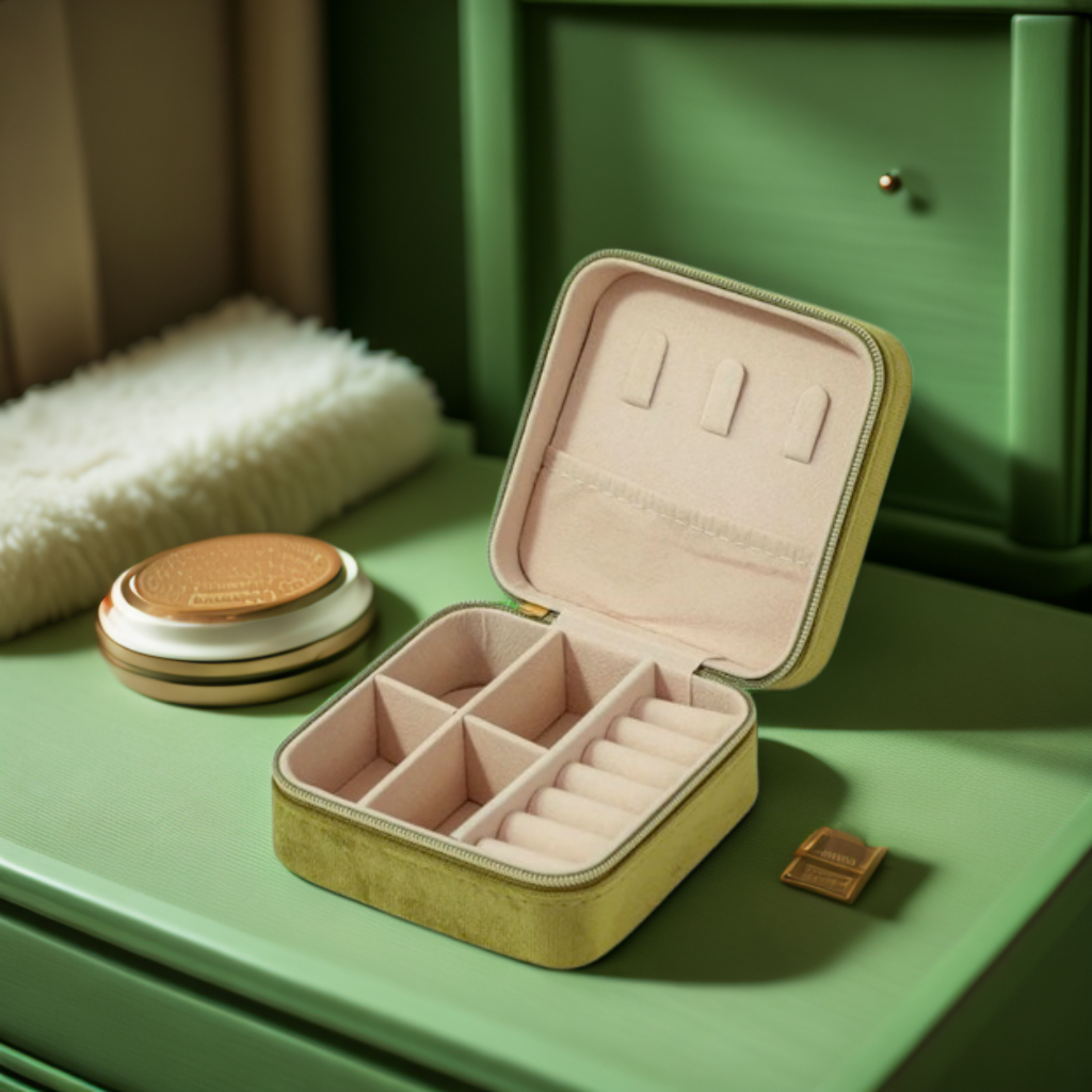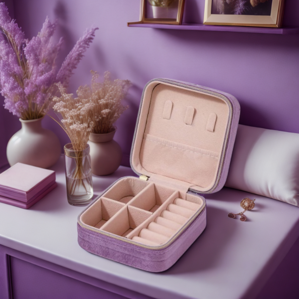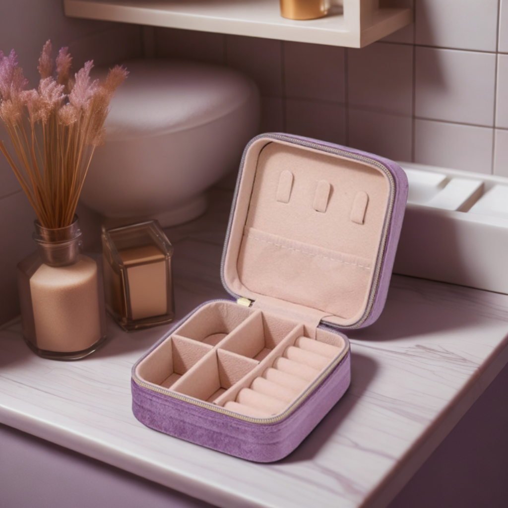 Des espaces dédiés pour vos bagues et des rangements sécurisés pour vos colliers, chaque détail est pensé pour garantir que vos trésors restent intacts, bien ordonnés et faciles d'accès, même en déplacement.