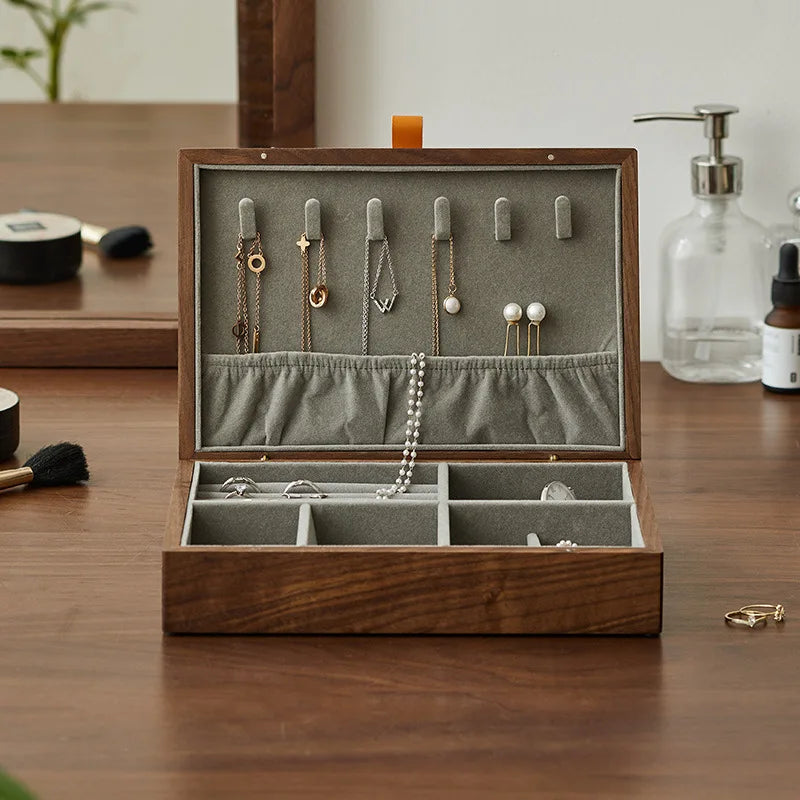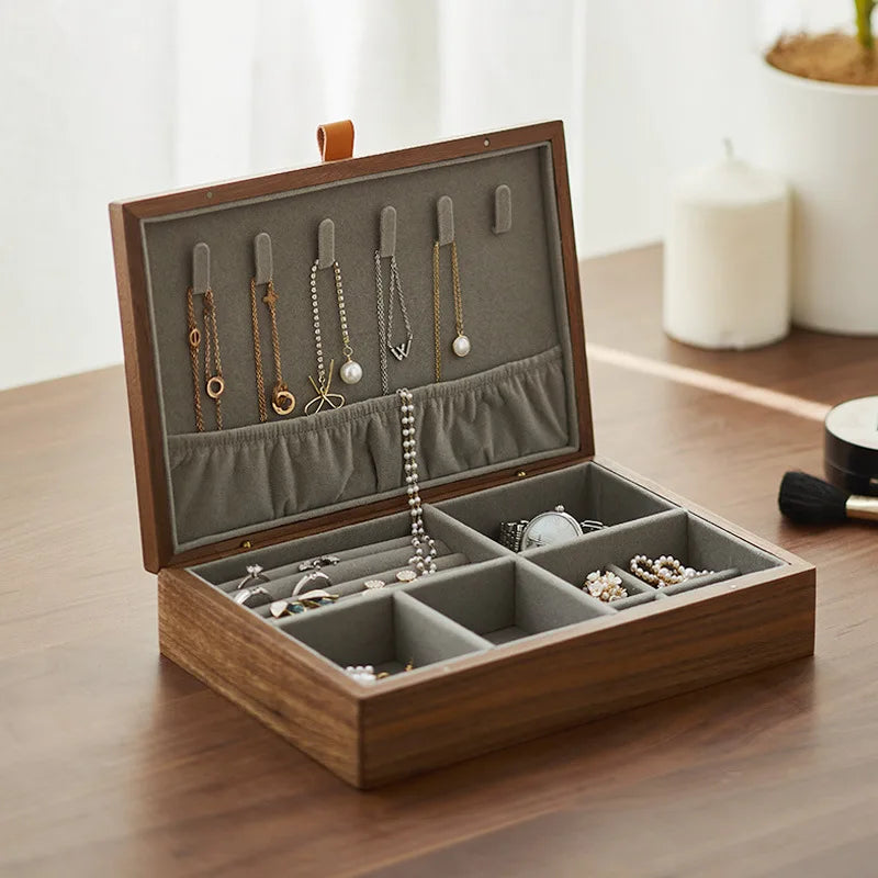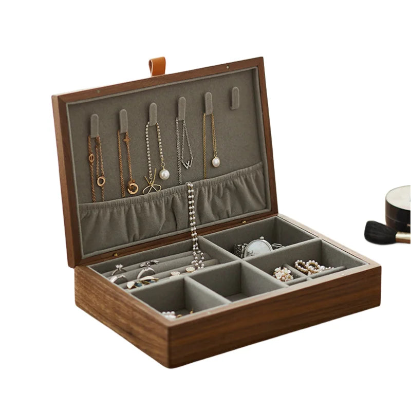 À l'intérieur, chaque compartiment a été pensé avec soin pour accueillir vos pièces les plus précieuses. Emplacements dédiés pour les bagues, support pour les colliers et espaces sécurisés pour vos boucles d'oreilles.